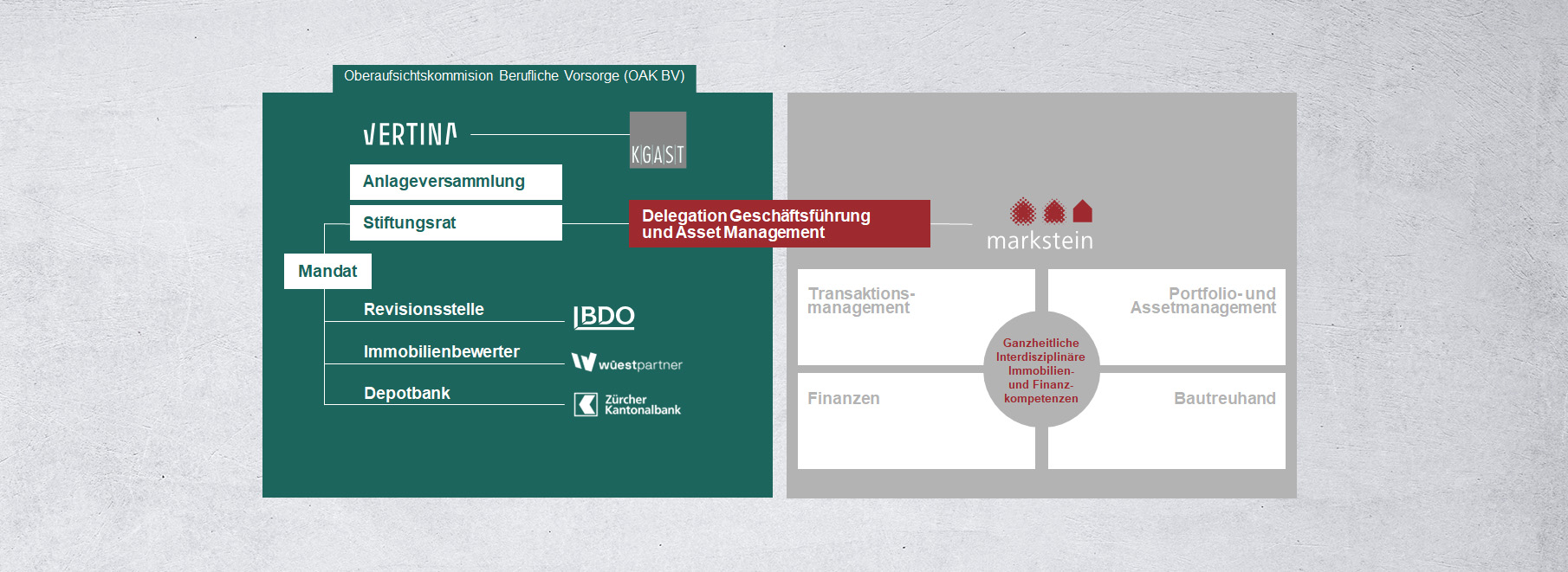 Durch die Kooperation von Vertina mit der Markstein Gruppe erhalten Einrichtungen der beruflichen Vorsorge Zugang zu einem umfassenden Kompetenzzentrum: Über 40 Spezialistinnen und Spezialisten vereinen Immobilien- und Finanzexpertise und gewährleisten ganzheitliche Dienstleistungen zu gunsten der Anlagegruppe Vertina Wohnen.